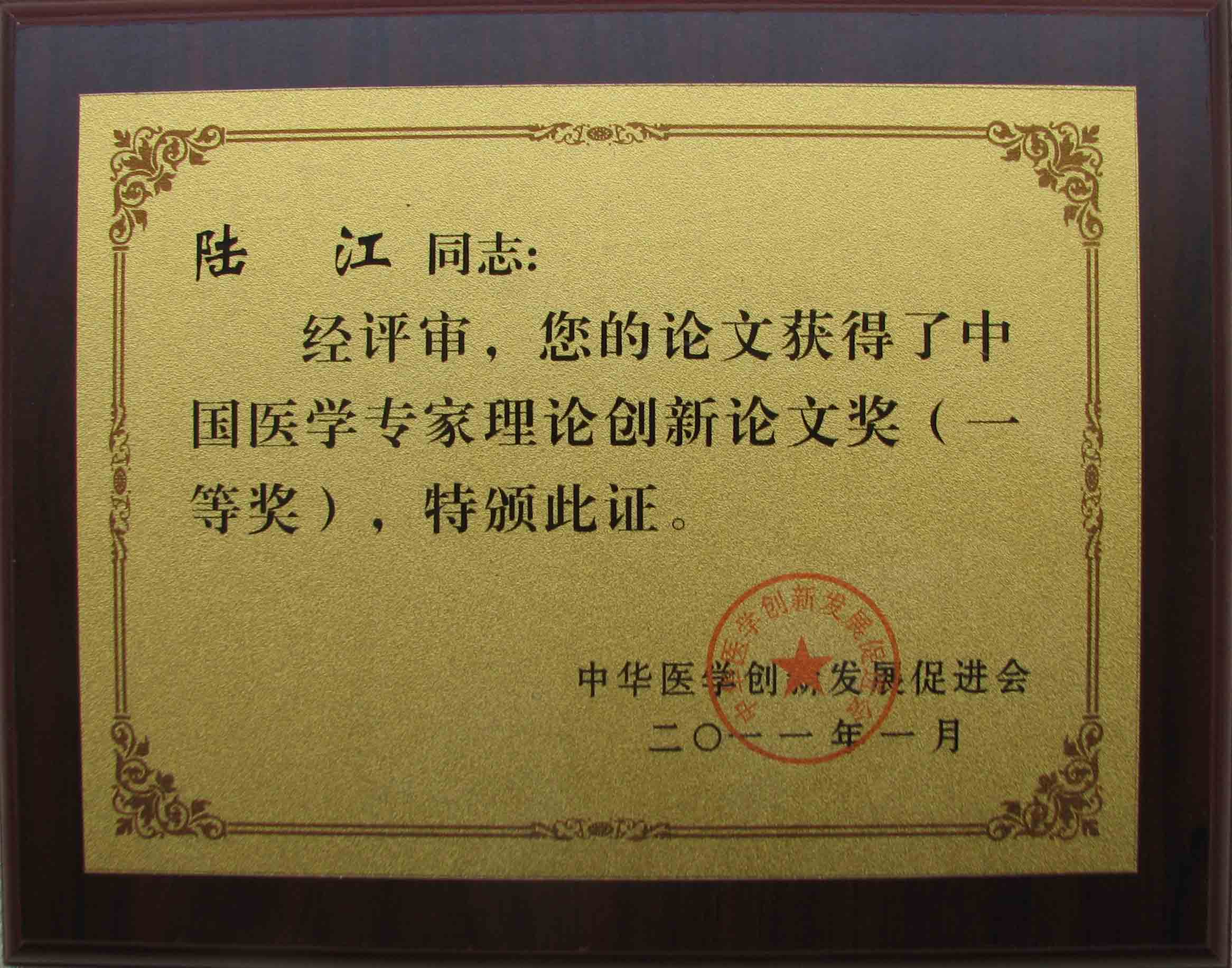 陸江的論文獲一等獎榮譽證書-- 陸江論文獲創新論文獎牌